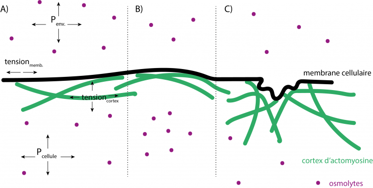 Ces dynamiques de changement de taille se font sur des temps très courts (quelques minutes). Le différentiel de pression osmotique à travers la membrane cellulaire influe donc sur la pression hydrostatique au sein de la cellule (force de tension appliqué par l’eau sur la membrane et le cortex). Cette dernière, relative aux échanges d’eau de la cellule avec son environnement et à ses variations de volume, va avoir un impact majeur sur les propriétés mécaniques de la cellule. En effet, la tension cellulaire dépend à la fois de la tension au niveau de sa membrane (qui peut être modifiée par un choc hyper ou hypo osmotique), et de la tension de son cortex, formé d’un réseau contractile de filaments d’actine ramifiés et non ramifiés et de myosine reliés à la membrane cellulaire. Comme le cortex est lié à la membrane, un changement de pression hydrostatique applique une tension sur la membrane, qui à son tour applique une tension sur le cortex d’actomyosine. Au-delà d’un certain seuil, la capacité du cortex à se contracter et à contrer cette tension est dépassée. En dessous de cette valeur seuil, la pression hydrostatique est suffisamment faible pour permettre au cortex d’actomyosine de se contracter, ce qui permet à la cellule d’adopter des formes spécifiques.