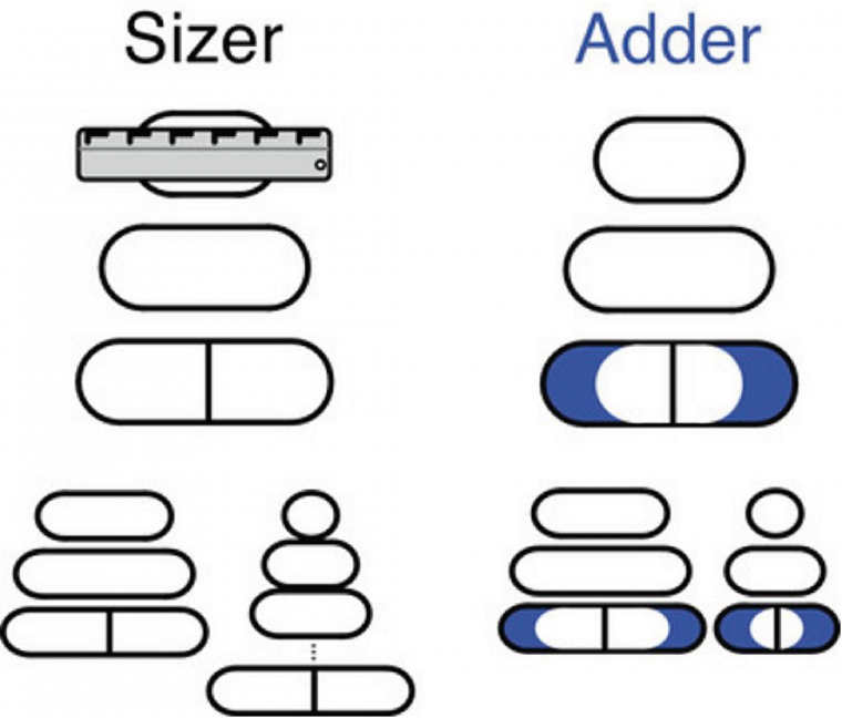 Le modèle adder : il propose que les cellules se diviseraient après un incrément de taille constant. Ce modèle se différencie du modèle sizer par deux aspects : 1) la taille initiale de la cellule mère va impacter la taille finale des deux cellules filles ; 2) l’augmentation de taille (ici appelé incrément de taille) au cours de la croissance est constante. Ainsi au fur et à mesure des générations et des divisions cellulaires, la cellule converge vers la moyenne de la population. Ce système assure automatiquement l’homéostasie de la taille.