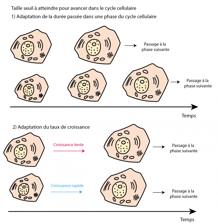 Une taille précise peut être obtenue soit par la modification de la durée des phases du cycle cellulaire, soit par la modification du taux de croissance au cours du cycle cellulaire.