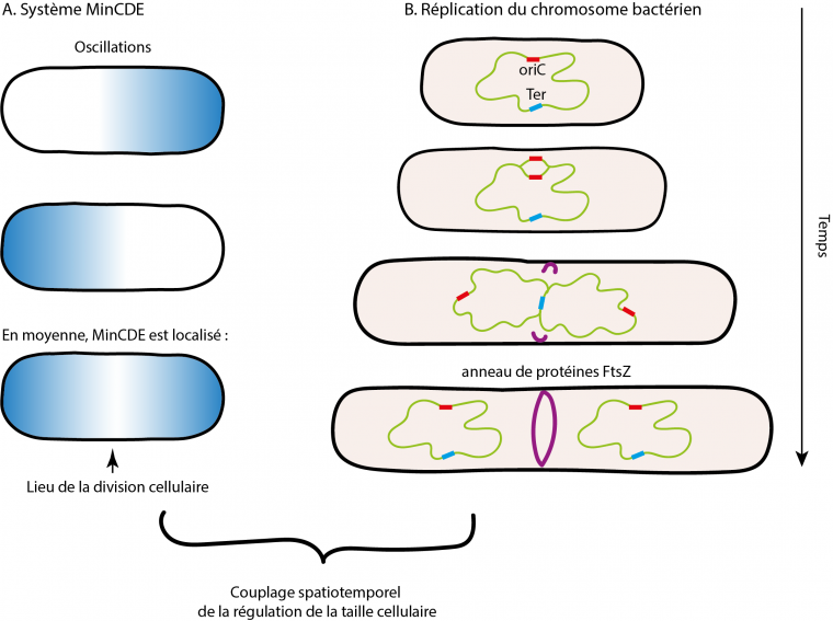 Ce mécanisme de régulation spatiale de la taille cellulaire semble être également couplé à une régulation temporelle. Pour la comprendre, il est nécessaire de rappeler que la réplication du chromosome bactérien se fait depuis une seule origine chromosomique de réplication (oriC) vers un site de terminaison (Ter). Au fur et à mesure de la réplication, les deux chromosomes ségrègent chacun d’un côté de la cellule en laissant en son centre la région Ter (Figure 5).