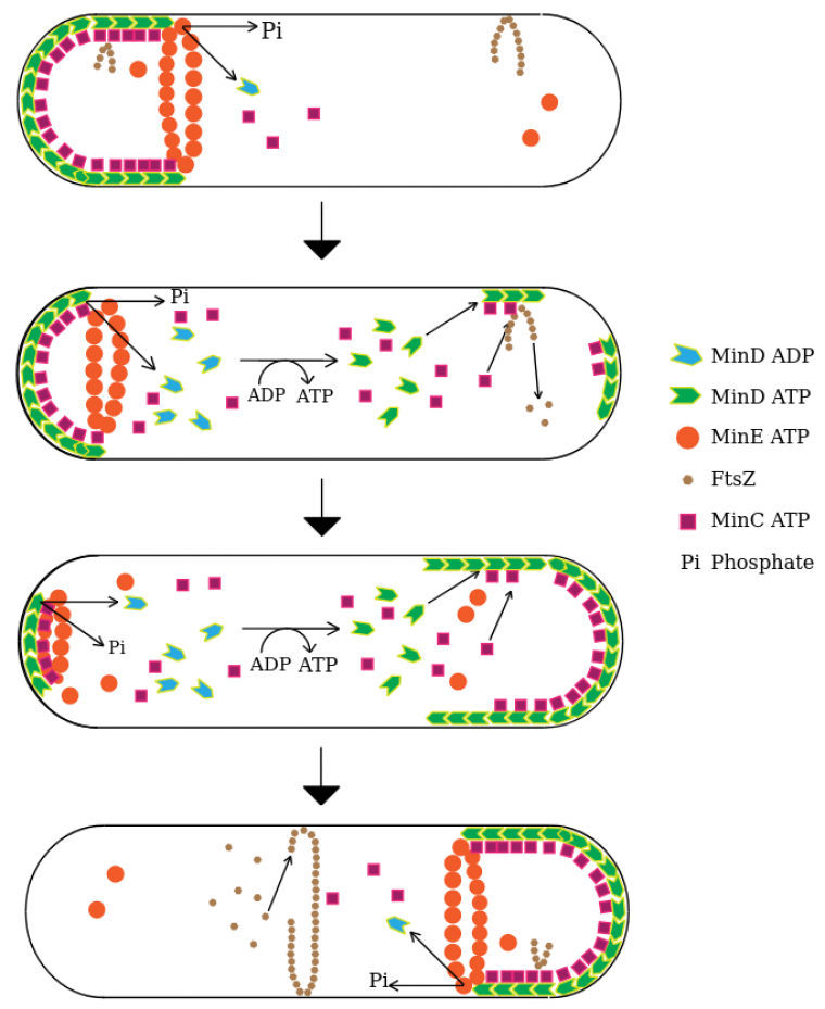 MinE, sous forme de dimère en conformation fermée, diffuserait également librement dans le cytoplasme, jusqu’à rencontrer un dimère MinD lié à l’ATP et à la membrane. Cette interaction va changer sa conformation vers une position ouverte, formant alors deux dimères asymétriques MinDE. Cette liaison déclencherait l’hydrolyse de l’ATP lié à MinD, induisant sa monomérisation et son détachement de la membrane ; il diffuserait alors, et pourrait être recruté au pôle opposé. MinE pourrait se réassocier avec d’autres dimères MinD environnants ou se détacher de la membrane et à son tour diffuser en conformation fermée. Ce mécanisme assurerait l’accumulation de MinE dans les régions où MinD est fortement concentré et donc le détachement de MinD. Ainsi, cette dynamique moléculaire pourrait expliquer que l’on observe une expression oscillante de MinD au niveau des deux pôles (extrémités) de la bactérie E. coli. La robustesse de cette oscillation aux pôles pourrait reposer sur différents mécanismes : la présence de signaux spécifiques aux pôles (composition lipidique) ou la courbure de la membrane.