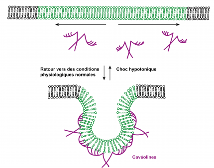 Les cellules animales peuvent résister aux chocs hypotoniques grâce à des réservoirs de membrane, appelés aussi cavéoles. Il s’agit de repliements de la membrane stabilisés entre autres par des protéines, les cavéolines, lorsque la cellule se trouve en conditions physiologiques normales. Lors de l’augmentation de volume de la cellule suite à un choc hypotonique, les cavéolines se désassemblent ce qui permet une augmentation de la surface membranaire et ainsi une adaptation à l’augmentation du volume cellulaire.