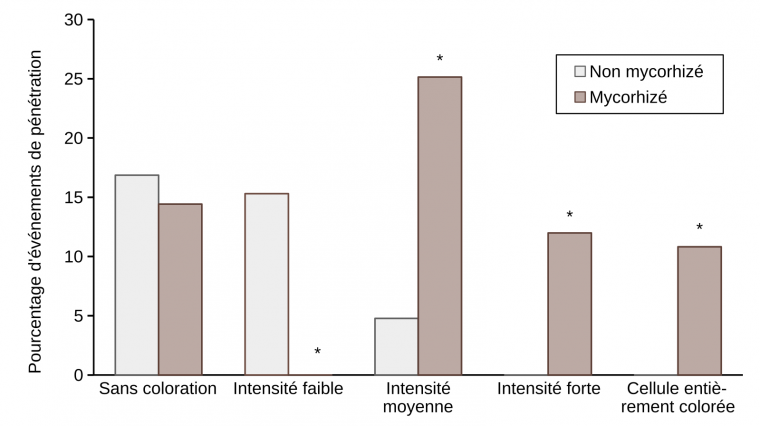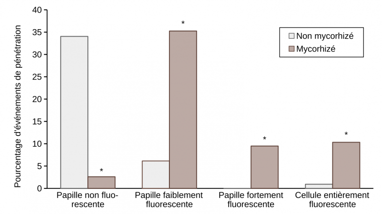 Tous les évènements ont été observés 21 h après infection sur la troisième feuille de cinq plantules distinctes. L’astérisque indique une différence significative entre les plantules non mycorhizées et mycorhizées selon le test LSD (P ≤ 0,05).