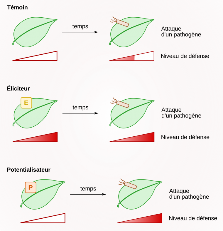 Selon le réseau mixte technologique Elicitra, les stimulateurs des défenses naturelles des plantes se définissent comme « toute substance ou tout micro-organisme vivant non pathogène qui, appliqué sur une plante, est capable de promouvoir un état de résistance significativement plus élevé par rapport à une plante non traitée, face à des stress biotiques ». Les stimulateurs des défenses naturelles des plantes sont des molécules pouvant entraîner une élicitation ou une potentialisation (Figure 11). L’élicitation correspond à une activation continue des défenses de la plante, en réponse à l’éliciteur, indépendamment de la présence d’un agent pathogène. La potentialisation (ou priming en anglais) correspond à une sensibilisation de la plante suite à une interaction avec des symbiotes ou des parasites. Lors d’une attaque ultérieure par un agent pathogène, elle engendre des réactions de défense plus fortes que celles observées chez un témoin n’ayant pas subi de potentialisation.