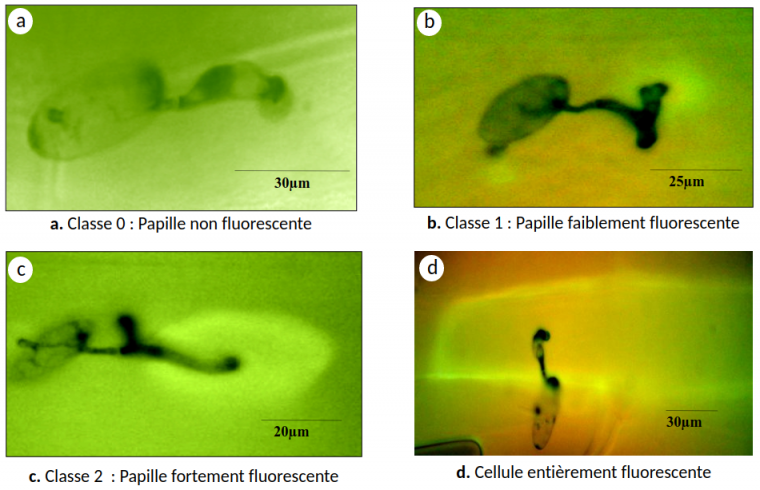 Au niveau des sites de pénétration de la feuille par B. graminis, la plante forme une papille qui accumule des composés phénoliques (voir Encadré 3). En fonction de l’intensité des composés phénoliques observés au microscope à fluorescence sous UV, trois classes ont été définies, classe 0 : papille non fluorescente, classe 1 : papille faiblement fluorescente et classe 2 : papille fortement fluorescente (Figure 5).