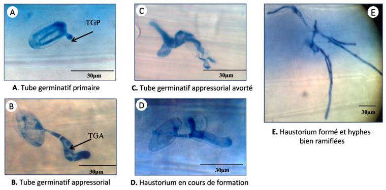 Nos résultats n’ont révélé aucune différence significative entre les plants mycorhizés et non mycorhizés concernant le stade « conidie avec un tube germinatif primaire » suggérant que la résistance induite par le champignon mycorhizien F. mosseae n’affecte pas la formation de ce tube. En revanche, le nombre de tubes germinatifs appressoriaux avec haustorium en cours de formation a été divisé par deux chez les plantes mycorhizées, ce qui montre que la mycorhization affecte la formation de l’haustorium (Tableau 1). Cela s’explique par une augmentation des tubes germinatifs appressoriaux avortés et de ceux sans haustorium. Toutes ces observations ont été effectuées 48 h après l’infection. Une observation un peu plus tardive, réalisée 72 h après l’infection, a montré que le nombre de tubes germinatifs appressoriaux avec haustorium bien formé était divisé par cinq chez les plantes mycorhizées. Il est à noter que la formation d’un haustorium est un facteur crucial pour la nutrition et le développement de l’agent pathogène fongique (Figure 4, Tableau 1).
