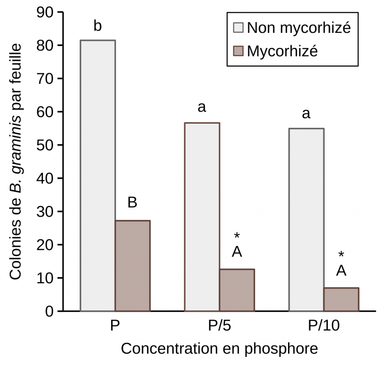 Le test d’infection a été effectué sur des plantules de blé âgées de 6 semaines et les colonies ont été comptées 8 et 11 jours après infection sur les cultivars de blé Orvantis et Lord respectivement. Les plantes ont été arrosées avec une solution de Hoagland contenant du phosphore à une concentration de [P/5] = 12,4 mg/L. Des lettres différentes indiquent une différence significative entre le nombre de colonies comptées sur les feuilles des cultivars de blé Orvantis (niveau de résistance = 5) et Lord (niveau de résistance = 7) non mycorhizé et mycorhizé.