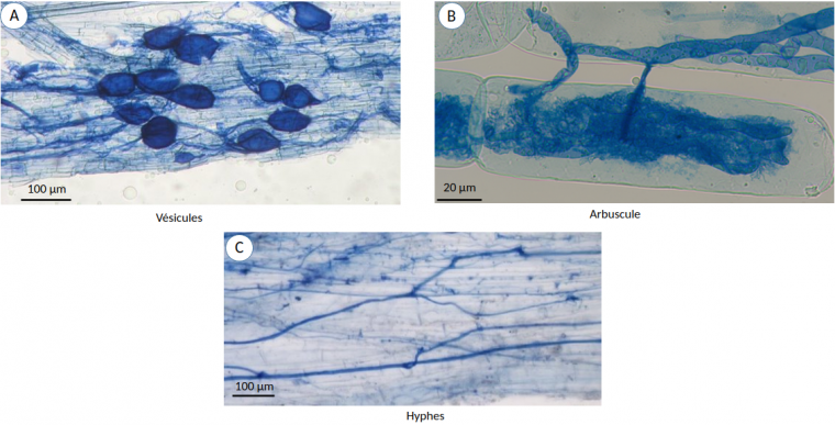 Différentes structures mycorhiziennes peuvent être observées : vésicules (A), arbuscule (B) et hyphes (C). Les vésicules constituent des structures de stockage (notamment de triacylglycérols), tandis que les arbuscules sont le siège d’échanges de nutriments entre les deux partenaires de la symbiose.