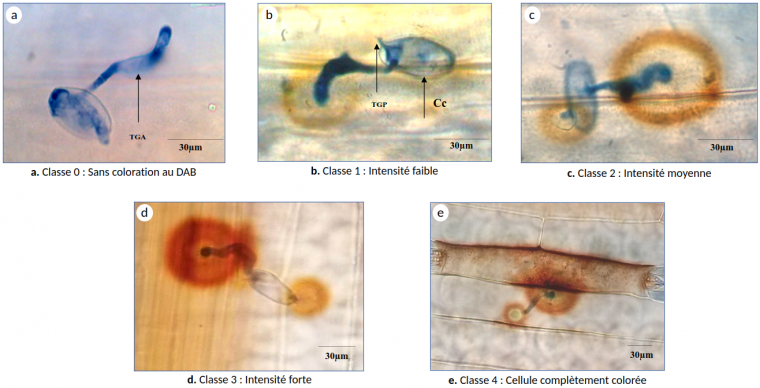 Lors de l’infection des feuilles de blé par B. graminis, une accumulation de peroxyde d’hydrogène (H2O2) dans les cellules épidermiques, autour des sites de pénétration par le tube germinatif appressorial de B. graminis, a été observée 21 h après infection grâce à une coloration au DAB (3,3‘-diaminobenzidine). Ce dernier polymérise localement dès qu’il est en contact avec H2O2 en présence de l’enzyme peroxydase. Plus la coloration marron est intense, plus l’accumulation de H2O2 est élevée. En fonction de l’intensité de cette coloration au DAB, quatre classes ont été définies : classe 0 : sans coloration au DAB, classe 1 : intensité faible, classe 2 : intensité moyenne, classe 3 : intensité forte et classe 4 : cellule entièrement colorée (Figure 7).