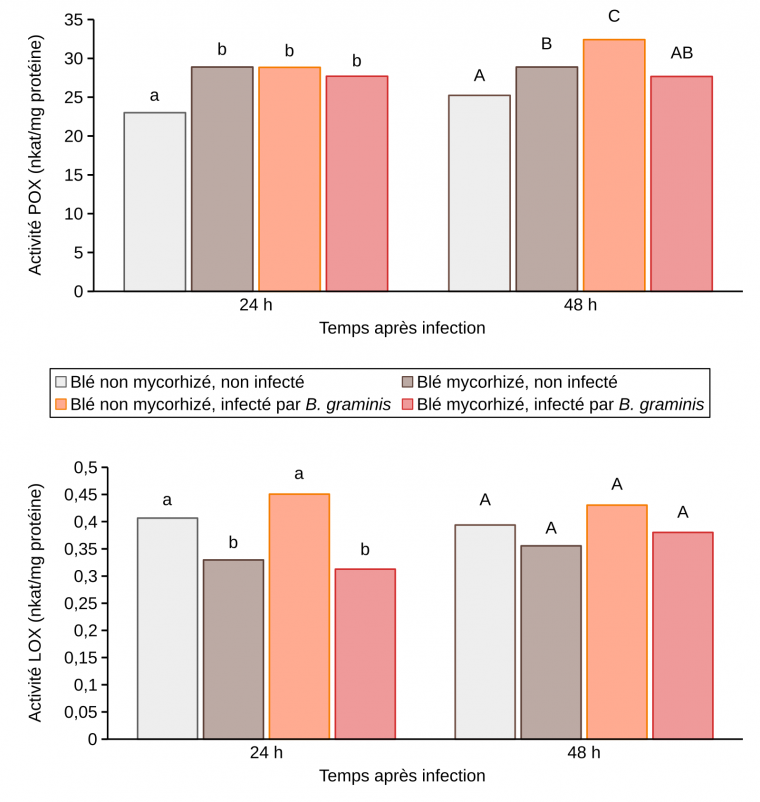Effet de l’inoculation mycorhizienne avec Funneliformis mosseae et de l’infection par B. graminis sur les activités enzymatiques POX et LOX dans les feuilles de blé 24 et 48 h après infection par B. graminis. nkat : nanokatal.