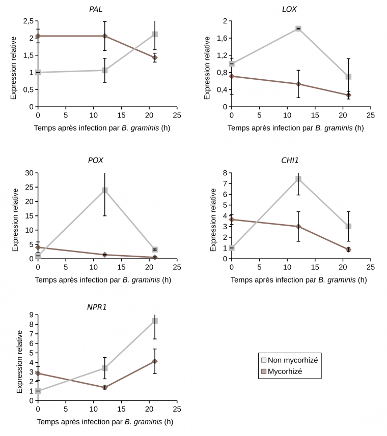 En contexte infectieux, c'est-à-dire en présence de B. graminis, ces mêmes gènes POX, PAL, CHI1 et NPR1 (à l'exception de LOX donc) étaient surexprimés chez les plantes non mycorhizées 12 heures après infection (et également 21h après infection pour PAL et NPR1) et réprimés chez les plantes mycorhizées (Figure 10). L’activité peroxydase était induite chez les plantes non mycorhizées 48 h après infection (Figure 9). Par contre, chez les plantes mycorhizées, aucune augmentation supplémentaire de l’activité peroxydase n’a été observée en présence du B. graminis. L’activité enzymatique de la LOX n’est pas modulée quel que soit le traitement observé sauf à 24h après infection chez les plants mycorhizés (Figure 9). L’ensemble de ces résultats suggère l’absence de potentialisation des réactions de défense chez le blé mycorhizé infecté (Encadré 4).