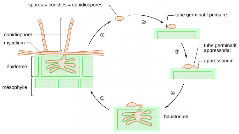 À la surface de la feuille de blé, la germination des conidies de B. graminis débute par l’émergence d’un tube germinatif primaire, puis celle d’un second tube germinatif nommé tube germinatif appressorial. Ce dernier se forme 5 à 8 heures après la perception de la surface de la feuille par le champignon. Suite à l’hydrolyse enzymatique de la cuticule, le tube germinatif appressorial traverse la paroi végétale et forme un appressorium. Celui-ci se différencie ensuite en haustorium au niveau de la membrane plasmique. Ce dernier assure le transfert des nutriments de la plante au champignon. À la surface de la plante hôte, se développe un mycélium qui forme des conidiophores. Ces derniers assurent la libération de nouvelles spores asexuées permettant la dissémination de l’agent pathogène (Figure 3).