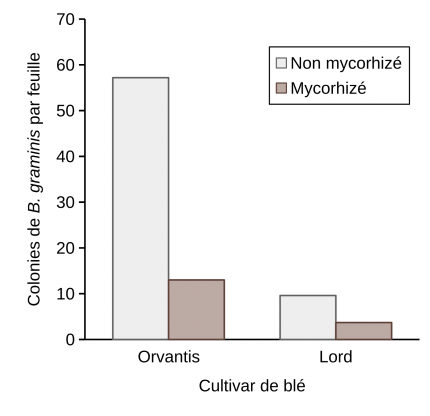 Quel que soit le niveau de sensibilité du cultivar testé, la mycorhization permet une protection contre B. graminis aussi bien chez Orvantis que Lord. Ce taux de protection est estimé à 78 et à 61 % respectivement.