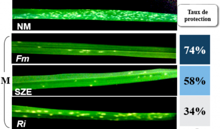Il est important de noter que, quel que soit le niveau de sensibilité du cultivar testé, un gain de protection contre B. graminis a été obtenu chez les blés mycorhizés par comparaison aux blés non mycorhizés. Ces résultats soulignent l’importance de la prise en compte de ce paramètre, autant pour optimiser l’efficacité de la protection du blé contre l’oïdium en réponse à la mycorhization, que pour étendre l’utilisation de ces pratiques culturales à différents cultivars sensibles ou modérément sensibles à la maladie.