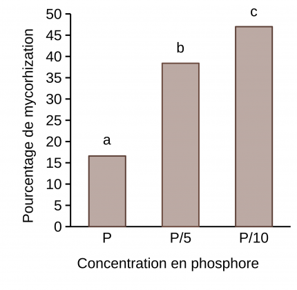 Par ailleurs, nous avons également observé que la diminution de la concentration en phosphore conduit à une augmentation du taux de mycorhization (Figure 13). Ces résultats confirment ce qui a été déjà largement décrit dans la littérature : l’établissement de la symbiose mycorhizienne est contrôlée par le régime de fertilisation au champ. Une fertilisation élevée en phosphore induit une diminution de la colonisation racinaire par les champignons mycorhiziens à arbuscules 1.