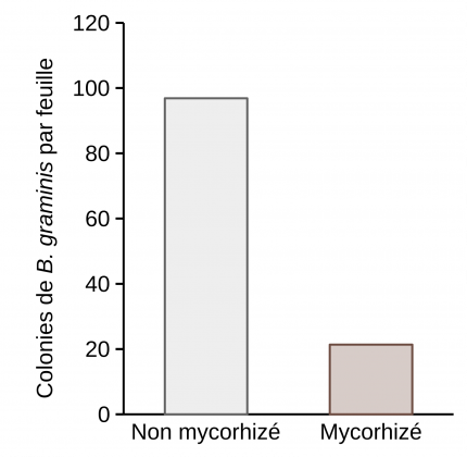 Après six semaines de culture, l’infection des plantules de blé a été effectuée par pulvérisation d’une suspension de spores de B. graminis (7,5 mL à 6,5.105 spores/mL). Le nombre de colonies sur les feuilles a été compté 12 jours après infection, sur des plantules âgées d’environ 8 semaines. Les taux d’infection par B. graminis ont été comparés chez des plants de blé mycorhizés ou non. Une réduction significative du nombre de colonies de B. graminis par feuille a été observée quand le blé est mycorhizé. Il passe de 96 chez les plants non mycorhizés à 21 chez les plants mycorhizés (Figure 1), ce qui correspond à un taux de protection de 78 % (voir Encadré 1). Ce résultat suggère que le champignon mycorhizien Funneliformis mosseae induit une résistance systémique chez le blé, contre l’infection par Blumeria graminis f. sp. tritici.