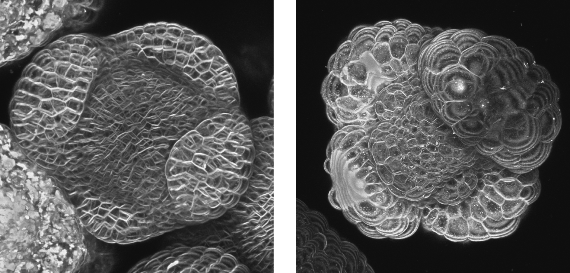 Méristème floral en croissance avant (à gauche) et après dépolymérisation des microtubules par l’oryzaline (à droite). Notez la forme sphérique des 4 sépales : les organes ont perdu leur direction de croissance préférentielle. Les cellules ont également une croissance isotrope qui les fait ressembler à des bulles de savon. Les deux images sont à la même échelle.