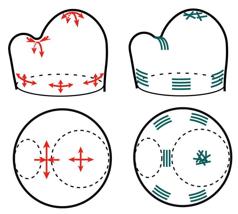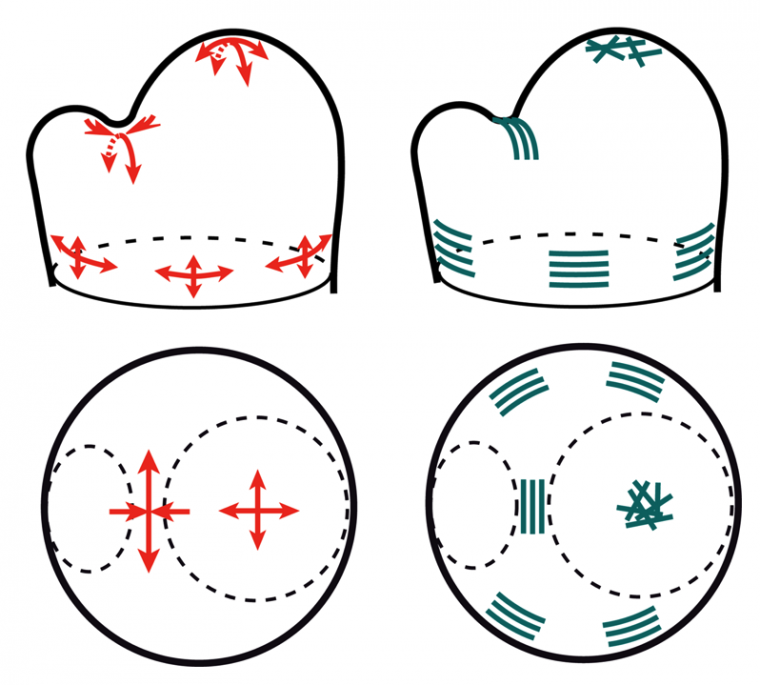 Les forces étant invisibles par nature, nous devons utiliser l’outil mathématique pour prédire l’intensité et l’orientation des contraintes mécaniques dans les tissus. Si l’on suppose que le tissu végétal est élastique, et que l’épiderme est limitant pour la croissance et sous tension (des hypothèses soutenues par une littérature abondante, voir par ex. Kutscera and Niklas, 2007), nous pouvons comparer le méristème à un ballon avec une enveloppe en tension (l’épiderme) et un tissu interne en compression. Outre le caractère pédagogique d’une telle analogie, cette comparaison nous permet de calculer facilement le patron des contraintes mécaniques dans le tissu, sur la base de connaissances bien établie en ingénierie des matériaux et des coques. Nous obtenons ainsi une carte des contraintes dans le méristème, avec des tensions dans toutes les directions au sommet du méristème, et des tensions tangentielles très fortes dans le pli entre méristème et organe. On voit ici que les tensions (prédites) et les microtubules (observés) sont co-alignés. Nous formulons donc l’hypothèse que les microtubules s’alignent le long des directions des tensions, couplant ainsi la morphogenèse avec la physique via les microtubules.