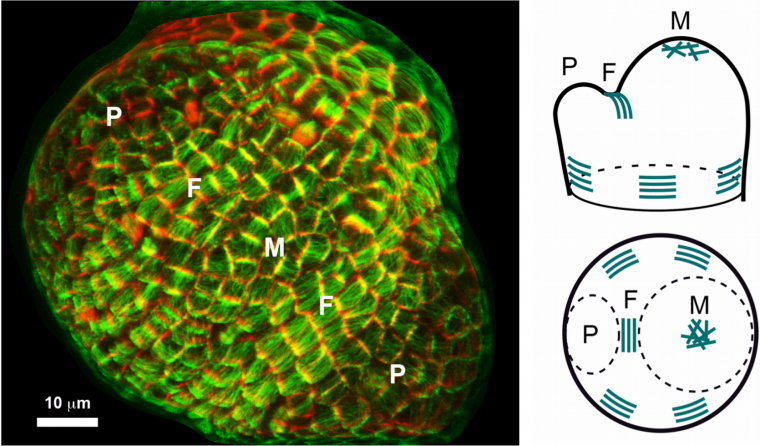 À gauche : Une protéine fluorescente (GFP) est fusionnée à une protéine associée aux microtubules. La coloration verte permet ainsi d’identifier le réseau des microtubules dans le méristème (M) ici vu de dessus. La coloration rouge marque le contour des cellules. Deux jeunes organes (primordia P) émergent à la périphérie du méristème. Les cellules du domaine frontière (F) entre organe et méristème présentent des microtubules tous alignés dans la même direction. À droite : Schéma d’interprétation décrivant le patron des microtubules dans le méristème. En haut à droite : vue de profil. En bas à droite : vue de dessus.