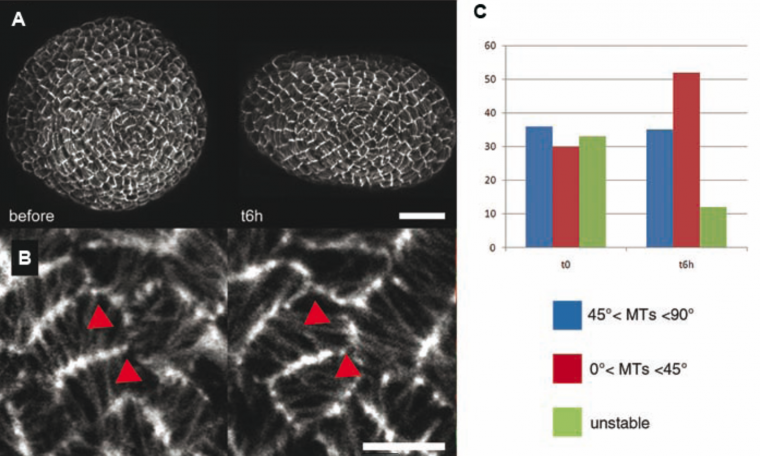 A. méristème apical caulinaire vue du dessus avant et 6 heures après compression latérale provoquée par la pression de deux lames de chaque côté du méristème. Barre d’échelle : 20 µm. B. Zoom sur quelques cellules : réorientation des microtubules après compression. Barre d’échelle : 5 µm C. Quantification de la réponse des cellules à la compression. Six heures après l’application de la contrainte, le nombre de cellules ne présentant pas d’orientation préférentielle des microtubules diminue (en vert) tandis que le nombre de cellules dont les microtubules font un angle de plus de 45° par rapport aux deux lames reste stable (bleu) et que le nombre de cellules dont les microtubules ont un angle inférieur à 45° par rapport aux lames augmente (rouge).