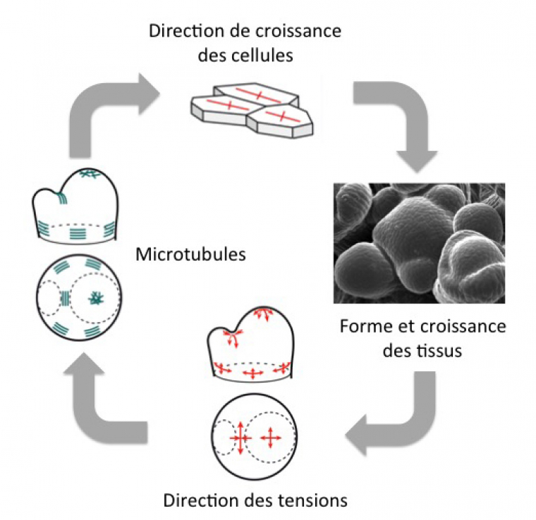 Au sommet du méristème, les tensions sont isotropes (de même intensité dans toutes les directions de l’espace), les microtubules ne présentent pas d’orientation préférentielle. Au niveau de la zone frontière, les tensions sont très anisotropes : elles sont beaucoup plus fortes dans la direction de l’axe du pli. Les microtubules sont alignés par rapport à cet axe. Enfin, sous le méristème, les tensions circonférentielles induites par la forme cylindrique de la tige sont deux fois plus fortes que les tensions axiales (dans le sens d’allongement de la tige). Les microtubules sont orientés dans le sens de la circonférence. On observe donc dans ces trois zones un co-alignement entre tensions et microtubules.