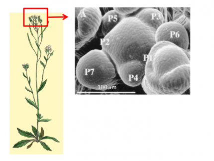 À gauche : partie aérienne de la plante Arabidopsis thaliana. À droite : méristème apical caulinaire d’Arabidopsis thaliana observé au microscope électronique à balayage. Le dôme central correspond au méristème sensu stricto (ici un méristème d’inflorescence); il est entouré de plusieurs très jeunes organes plutôt sphériques (les jeunes boutons floraux notés, du plus jeune au plus âgé, P1 à P7). Notez la présence de plis dans le domaine frontière séparant le méristème des organes en croissance.