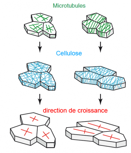 L’orientation des microtubules (en vert) contrôle le dépôt des microfibrilles de cellulose (en bleu) qui déterminent la direction de croissance des cellules (en rouge) : la pression de turgescence est le moteur de la croissance, et l’orientation de la cellulose restreint la croissance dans une direction perpendiculaire aux arceaux de cellulose. À gauche, les microtubules ne présentent pas d’orientation préférentielle : les cellules peuvent grandir dans toutes les directions. Par contre, à droite, les microtubules sont globalement parallèles les uns aux autres, ce qui impose aux cellules une direction de croissance orthogonale.