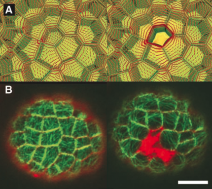 A. Modélisation des contraintes mécaniques dans l’épiderme du méristème avant et après ablation d’une cellule : les tensions (en rouge) deviennent circonférentielles autour de l’ablation. B. Observation des microtubules avant et 6 heures après l’ablation de deux cellules dans l’épiderme (en rouge au centre) : les microtubules forment un anneau circonférentiel autour de l’ablation.