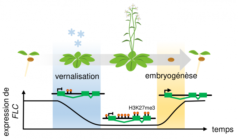 Les marques épigénétiques, qu'il s'agisse de modifications d'histones ou de méthylation de l'ADN, jouent un rôle clé dans la modulation de l'expression des gènes selon les types cellulaires et les conditions environnementales. Chez la plante modèle Arabidopsis thaliana, ces mécanismes sont essentiels dans le contrôle de la floraison qui repose notamment sur la régulation de l'expression du gène FLC. En effet, ce gène est un inhibiteur majeur de la floraison et est fortement exprimé chez les jeunes plants, ce qui les empêche de fleurir avant le printemps. Pendant l'hiver, l'exposition au froid et aux courtes photopériodes déclenche une cascade épigénétique complexe qui, par des modifications d'histones répressives, inactive progressivement l'expression de FLC, permettant ainsi la floraison au retour des beaux jours.