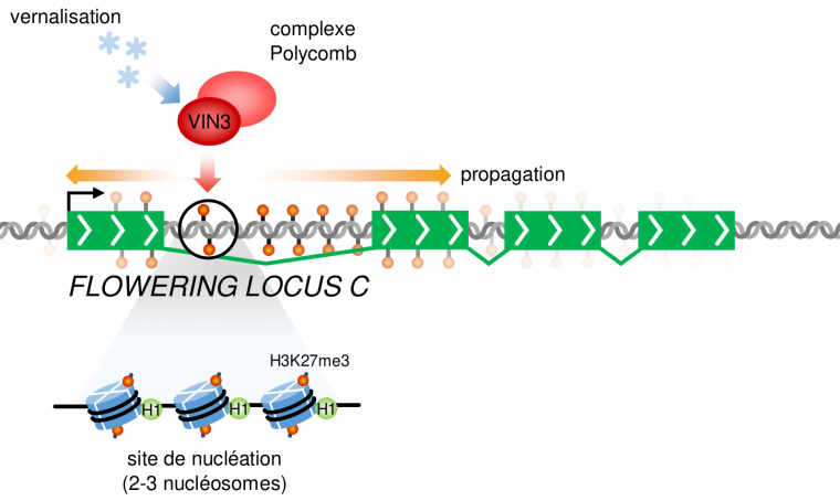 Cette propagation à l’ensemble du locus de l’état chromatinien répressif induit par Polycomb (représenté en particulier par H3K27me3) est essentielle à la stabilité de la répression de FLC et, si elle ne se fait pas, FLC est progressivement réactivé en moins de 20 jours après la remontée des températures [10]. En effet, si une modification d’histone est présente sur un nombre trop faible de nucléosomes, comme c’est le cas pour les trois nucléosomes du site de nucléation, cette modification est progressivement perdue au cours des divisions cellulaires, puisqu’à chaque division il y a une probabilité significative (0,53 soit 12,5 %) qu’un des brins filles n’hérite d’aucun des trois nucléosomes mères. Une fois les modifications d’histones perdues sur un brin elles ne peuvent plus être prises en compte et rétablies par les boucles de lecture/écriture assurées par Polycomb et l’allèle de FLC que ce brin porte est définitivement réactivé. Au contraire, si elle est propagée à l’ensemble du locus (environ 30 à 35 nucléosomes) les mécanismes de lecture/écriture associés aux marques H3K27me3 sont suffisants pour maintenir l’état chromatinien au travers des duplications cellulaires malgré une répartition aléatoire des nucléosomes à chaque division [11]. La floraison peut donc avoir lieu.
