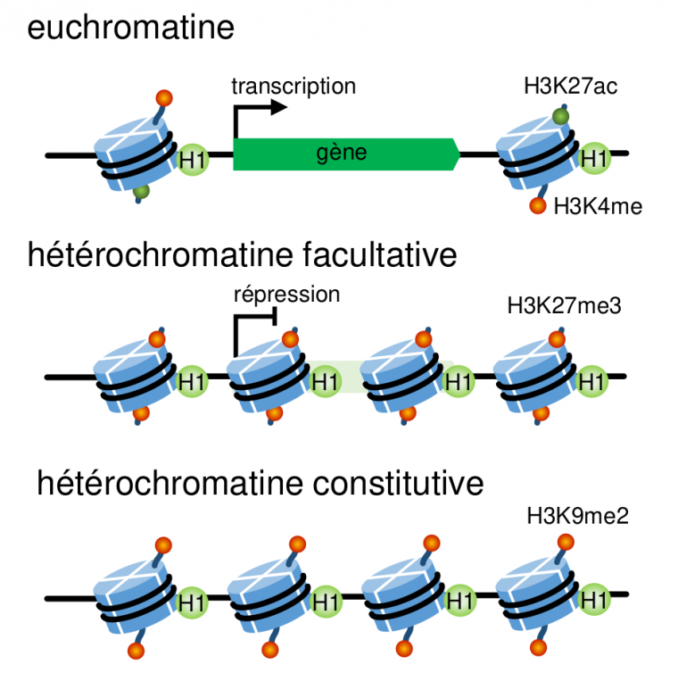 En fonction de l’impact que ces modifications apportent à la charge apparente du nucléosome, la densité locale des nucléosomes avoisinants va être modulée. De plus, comme les enzymes à l’origine de ces modifications agissent généralement sur plusieurs nucléosomes adjacents, on obtient des régions aux nucléosomes plus ou moins denses et donc à la chromatine plus ou moins compacte. Une chromatine lâche, très facilement accessible et donc favorable à l’expression des gènes, est appelée euchromatine, alors qu’une chromatine fortement condensée, très peu accessible et ne permettant donc pas l’expression des gènes est appelée hétérochromatine. Par exemple, la méthylation de la lysine 4 de l’histone H3 (H3K4me) ou l’acétylation de la lysine 27 de la même histone (H3K27ac) sont des marques activatrices caractéristiques de l’euchromatine, au contraire de la triméthylation de la lysine 27 de l’histone H3 (H3K27me3) qui est généralement répressive (en augmentant la condensation). Cependant, en raison de boucles de rétroaction entre modifications d’histones, certaines sont moins labiles que d’autres ce qui peut empêcher toute transition entre états euchromatiques et hétérochromatiques. Notamment, la diméthylation de la lysine 9 de l’histone H3 (H3K9me2) est répressive et, étant associée via des boucles de rétroaction positives à la méthylation de l’ADN, est très stable au cours du développement de l’organisme. Au contraire, la marque H3K27me3 n’apparaît que très rarement sur des régions d’ADN méthylé [3], et est donc beaucoup plus labile. Les régions réprimées par H3K27me3 peuvent donc être plus facilement réactivées que celles marquées par H3K9me2. Les premières forment l’hétérochromatine facultative et les secondes l’hétérochromatine constitutive (Fig. 3).