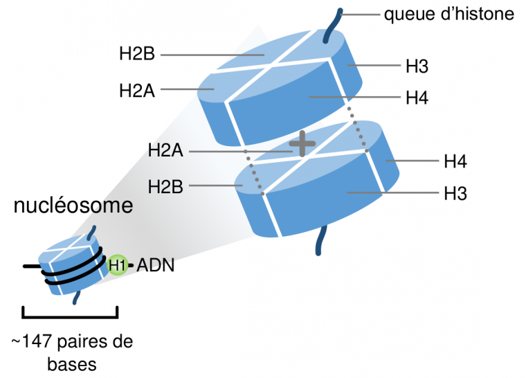 L’ADN est un long polymère de nucléotides, fortement condensé jusqu’à tenir dans les noyaux cellulaires de quelques micromètres de diamètre. Le premier niveau de condensation de l’ADN est obtenu par son enroulement autour des histones, protéines propres aux Eucaryotes et aux Archées. Ces histones sont présentes dans le génome sous différentes formes, les principales étant, chez les Eucaryotes, les histones H1, H2A, H2B, H3 et H4. Ces histones s’assemblent en octamères constitués de deux tétramères H2A+H2B+H3+H4 autour desquels l’ADN s’enroule sur presque deux tours (environ 147 paires de bases) formant ainsi les nucléosomes (Fig. 2). L’histone H1, appelée histone de liaison, ne fait pas partie du nucléosome à proprement parler, mais se joint aux brins d’ADN en sortie du nucléosome et semble protéger ainsi l’ADN entre deux nucléosomes (aussi appelé ADN de liaison) même si son rôle exact reste à élucider.