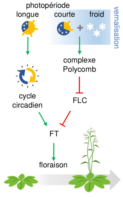 Chez cette espèce, les mécanismes moléculaires responsables de la synchronisation de la floraison avec la fin de l’hiver ont été finement disséqués et un gène clé a été identifié : FLOWERING LOCUS C (FLC). Ce gène code un répresseur central de toute la cascade moléculaire régulant la transition d’un état végétatif à un état reproductif, et sa forte expression dès la germination bloque toute floraison. Ainsi, il maintient la plante dans un état végétatif tant qu’il n’est pas lui-même inhibé par exposition combinée au froid et aux courtes photopériodes hivernales (vernalisation1) qui va ainsi permettre l’activation par le cycle circadien du facteur déclencheur de la floraison (codé par FLOWERING LOCUS T ou FT ; Fig. 1).