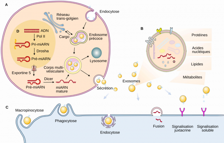 Le mécanisme de transfert d’une cellule à l’autre implique très probablement des exosomes, de petites vésicules extracellulaires mesurant entre environ 30 et 150 nm de diamètre. Ces exosomes, appelés épididymosomes, sont secrétés spécifiquement par les cellules épithéliales de l’épididyme et récupérés par les spermatozoïdes. On sait par l’étude d’autres systèmes cellulaires que des exosomes sont capables de transporter des miARN d’une cellule à l’autre. Les chercheurs démontrent dans l’article que le profil des miARN des spermatozoïdes ayant traversé un épididyme déficient en miARN peut être restauré par une exposition à des exosomes produits par un épididyme normal.