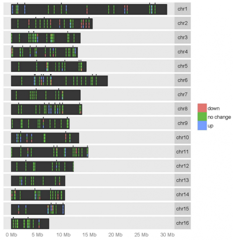 Pour chaque chromosome, la ligne supérieure représente les niveaux d’expression des miARN chez les reines par rapport aux ouvrières, la ligne médiane représente les mâles par rapport aux ouvrières et la dernière ligne représente les mâles par rapport aux reines. La couleur verte indique qu’il n’y a pas de différence statistiquement significative dans l’expression des miARN entre les deux castes comparées, le rouge représente une régulation négative et le bleu représente une régulation positive. Les points situés au-dessus de chaque chromosome indiquent l'emplacement des nouveaux miARN décrits pour la première fois dans cette étude.