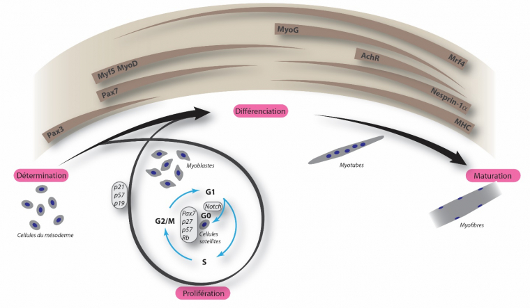 Évènements génétiques et cytologiques au cours de la formation des fibres musculaires. La durée et le niveau d’expression de gènes clés sont indiqués en marron. De la détermination des cellules du mésoderme à la maturation en myofibres, de nombreuses étapes sont nécessaires. L’expression de gènes clés, tels que Pax3, Myf5 et MyoD, est requise pour atteindre le stade de myoblaste. Les muscles ayant besoin de se régénérer au cours de la vie, une réserve de cellules souches musculaires est maintenue grâce au renouvellement des cellules satellites et l’expression de gènes clés, indiqués dans les petites cartouches. Les myoblastes et les cellules satellites constituent les cellules myogéniques. La différenciation et la maturation sont caractérisées par une expression, finement régulée dans le temps, d’autres gènes, tels que MyoG et MHC.