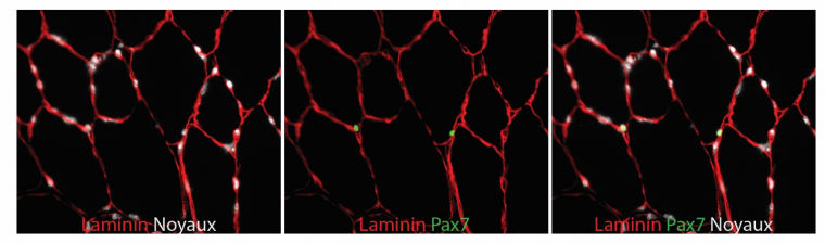 Sur cette coupe, seules deux cellules satellites marquées par Pax7 sont visibles sous la lame basale de deux fibres différentes.