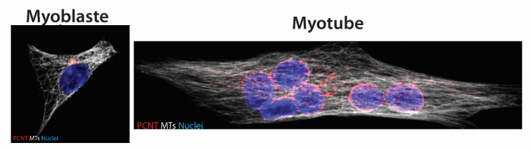 Relocalisation du centrosome (visualisé par la fluorescence rouge de la péricentrine, PCNT, une protéine du centrosome) à l’enveloppe nucléaire et réorganisation des microtubules (MTs) lors de la différenciation. Dans le myoblaste, les microtubules émanent du centrosome de manière radiale, tandis qu’ils ont une organisation majoritairement parallèle dans le myotube. Les noyaux apparaissent bleus.