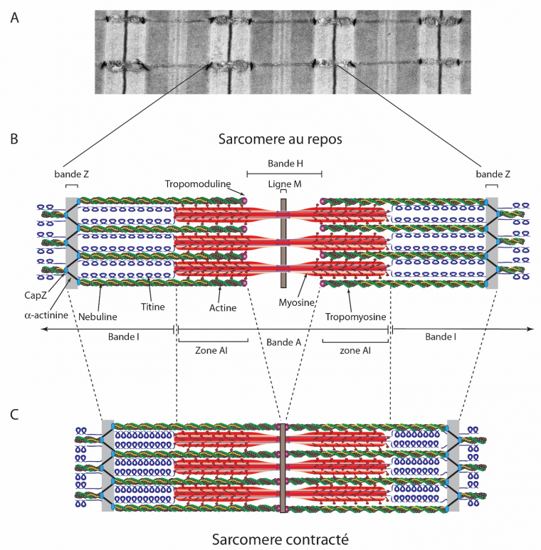 A : Section fine d’un muscle de souris observé au microscope électronique à transmission. B, C : Les sarcomères sont des répétitions de structures composées principalement d’actine (en gris) et de myosine (en rouge). La nébuline (en jaune) s’étend le long des filaments d’actine, tandis que la titine (en bleu) s’étire entre la bande Z et la ligne M. L’alpha-actinine et CapZ sont des composants de la bande Z. La tropomyosine (en vert) s’étend le long des filaments d’actine jusqu'à la tropomoduline (violet). Dans un sarcomère contracté, la longueur des filaments d’actine et de myosine ne varie pas. La contraction s’opère par un glissement des filaments d’actine sur les filaments de myosine.
