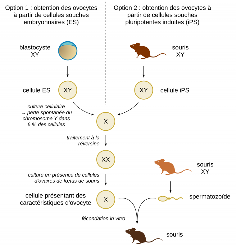 Le nombre de chromosome X a été ensuite doublé par traitement avec la réversine, une molécule qui perturbe les points de contrôle lors du cycle cellulaire. Les cellules souches embryonnaires (désormais XX) ont été ensuite soumises au protocole de différenciation en ovocytes qui implique des cocultures avec des cellules provenant d’ovaires de fœtus de souris. En effet, les signaux échangés entre les cellules folliculaires et les cellules germinales ne sont pas encore bien caractérisés et il est donc impossible d’induire la différenciation par voie chimique uniquement. Des cellules présentant des caractéristiques d’ovocytes tant du point de vue morphologique que cytologique ont pu être obtenues, ce qui n’est jamais le cas avec des cellules souches embryonnaires XY soumises au même protocole. Ces ovocytes ont pu être fécondés avec des spermatozoïdes et après réimplantation dans une mère porteuse, les embryons obtenus ont pu donner des souriceaux normaux.