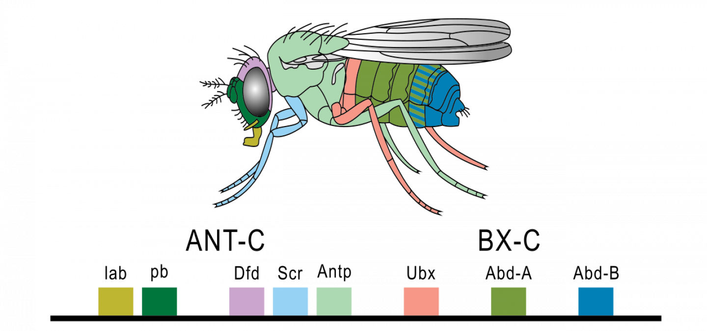 On note une similarité de la fonction régulatrice le long de l’axe antéropostérieur des codes Hom-C et Hox chez la drosophile et la souris. |