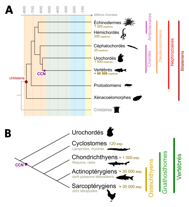 (A) Phylogénie simplifiée des organismes Bilatériens. L’ancêtre hypothétique des Bilatériens est appelé Urbilateria. Celui-ci a donné naissance aux Xénacoelomorphes, un groupe aujourd’hui réduit et dont la position systématique est discutée, et aux Néphrozoaires, eux-mêmes divisés en Protostomiens et en Deutérostomiens. Nous-mêmes, Vertébrés, appartenons aux Deutérostomiens Chordés, et les Urochordés sont, chez les Chordés, nos plus proches cousins. Un des premiers Vertébrés connu est Myllokunmigia (faune de Chengjang, environ 520 millions d’années). Le nombre d’espèces de Deutérostomiens ainsi que l’apparition des cellules des crêtes neurales (CCN) sont indiqués. Les âges sont en millions d’années. D’après Cannon et al., 2016.