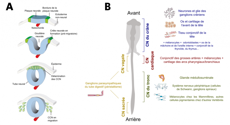 Les cellules des crêtes neurales ne sont présentes qu’à l’état embryonnaire, et se différencient (après migration) en de multiples types cellulaires au cours du développement (ces cellules sont dites « multipotentes »). Les dérivés de ces cellules diffèrent quelque peu selon la position de celles-ci dans l’embryon (Fig. 2B). Par exemple, les cellules de la région vagale et sacrée ont des potentialités assez restreintes et deviennent principalement les ganglions parasympathiques du tube digestif (importants pour le péristaltisme, c’est-à-dire les contractions musculaires synchronisées des viscères). Les cellules des crêtes neurales du tronc ont des devenirs plus variés, tandis que la palme est remportée par celles du crâne qui peuvent tout à la fois permettre la formation de différents tissus conjonctifs – tissus adipeux (adipocytes), cartilage (chondroblastes) et tissu osseux (ostéoblastes) – mais aussi de tissu musculaire (myocytes), de glandes sécrétrices (thyroïde, parathyroïde), de cellules nerveuses (neurones et cellules gliales) et de cellules pigmentaires (mélanocytes). On peut par ailleurs noter que ces dernières sont produites par toutes les régions de la crête neurale (crête neurale sacrée et vagale exceptées) [6].