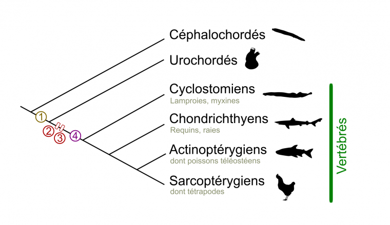 1. Acquisition de cellules possédant quelques caractères de cellules des crêtes neurales (ces cellules proviennent de la bordure de la plaque neurale, migrent mais ne se différencient qu’en quelques types cellulaires). 2. 1R : première duplication du génome. 3. 2R : seconde duplication du génome. 4. Acquisition de cellules des crêtes neurales au sens strict : ces cellules donnent des dérivés beaucoup plus nombreux que ceux retrouvés chez les Urochordés.