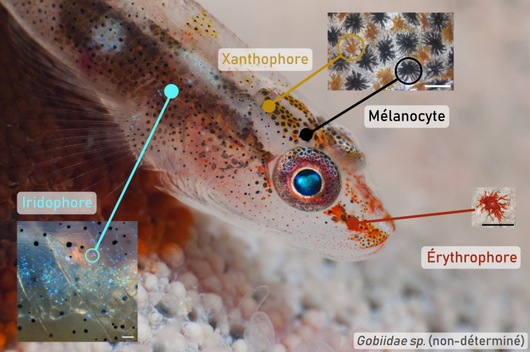 Les cellules des crêtes neurales sont à l’origine des cellules pigmentaires. Alors que les Mammifères n’en ont qu’un seul type (les mélanocytes), les poissons téléostéens peuvent en compter plusieurs. Par exemple, chez certaines larves de poissons coralliens (ici une espèce indéterminée de Gobiidae), on peut observer quatre types de cellules pigmentaires : des mélanocytes noirs, à l’instar des Mammifères, mais également des xanthophores (jaune-orange), des érythrophores (rouges) et des iridophores (argentés). La larve mesure environ 2 cm de longueur totale (1 cm visible sur le cliché) ; barres d’échelles des encarts : 50 µm.