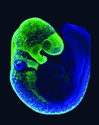 Les CCN ont été marquées par fluorescence verte (protéine fluorescente verte, ou GFP). On peut observer qu’elles forment une bande continue du côté dorsal, depuis laquelle émergent des files de cellules qui se déplacent ventralement. La tête est en particulier recouverte de CCN, soulignant le rôle essentiel que ces cellules jouent dans la formation de la tête des Vertébrés (os et cartilage, tissu conjonctif, ganglions crâniens…). Cette image a été fournie par Amanda Barlow et Paul Trainor, Stowers Institute for Medical Research