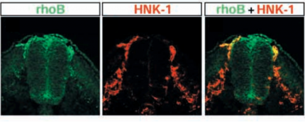 Les cellules des crêtes neurales en migration expriment la protéine de surface HNK-1 (au milieu, en rouge), alors que les CCN en préparation pour la migration, dans la partie dorsale du tube neural, expriment fortement rhoB (à gauche, en vert). Les cellules du tube neural, plus ventrales, ainsi que d’autres types cellulaires expriment également rhoB, mais faiblement. La fluorescence jaune (à droite) traduit la colocalisation des deux protéines. On constate que les cellules qui migrent vers le côté ventral de l’embryon perdent l’expression de rhoB. Cette protéine est nécessaire à la ré-organisation du cytosquelette en préparation à la migration des CCN.