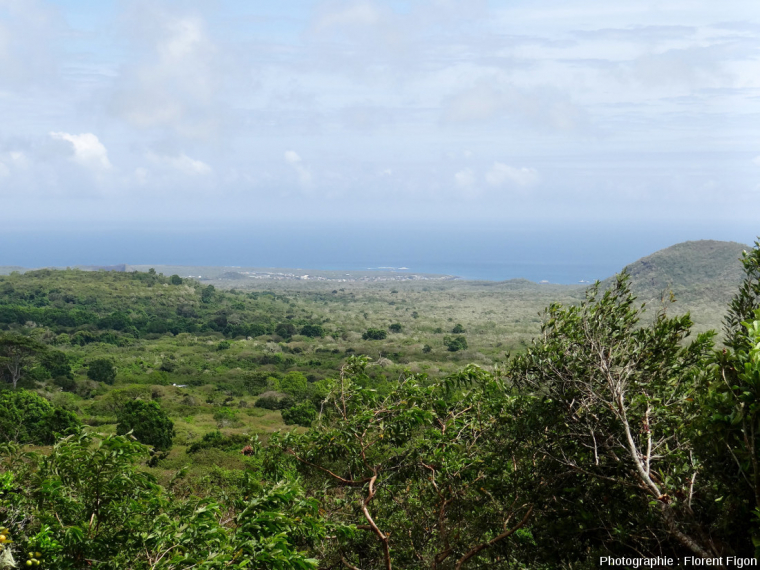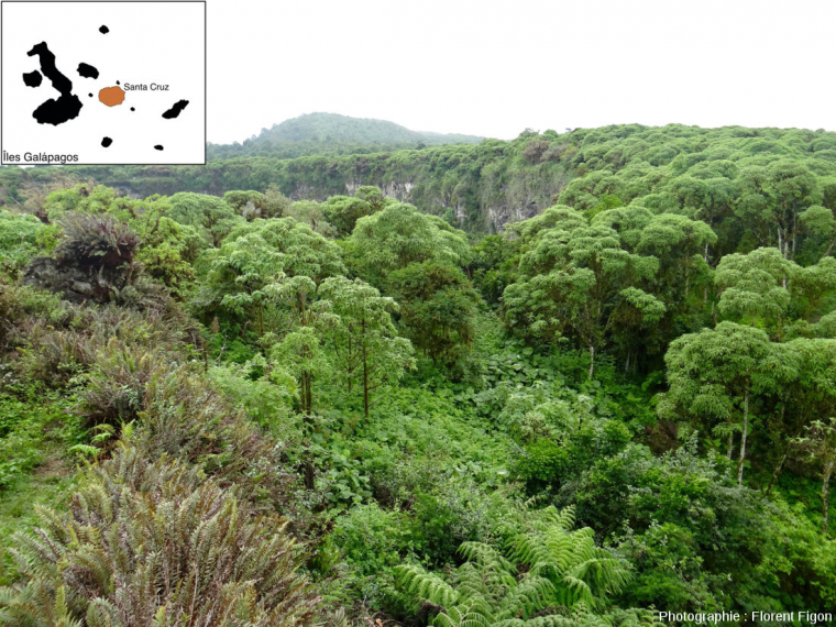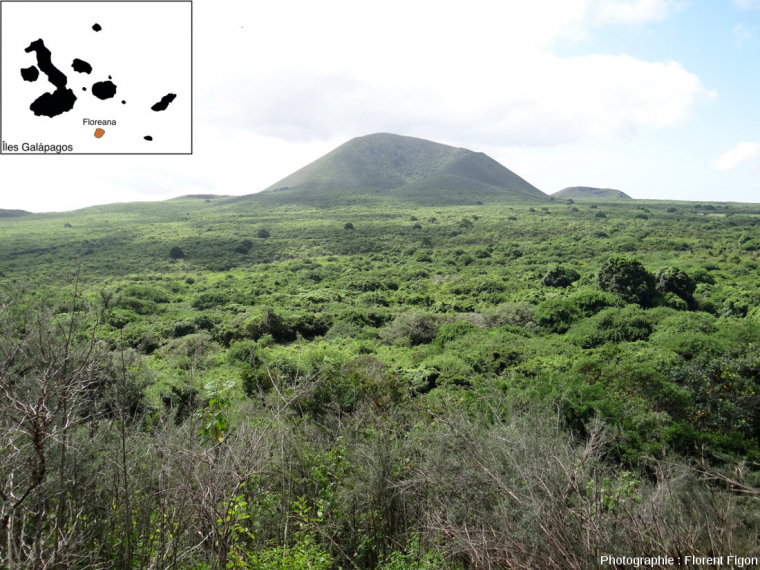 On reconnaît en arrière-plan la zone aride peu végétalisée. Une transition se fait alors vers une végétation plus dense et verdoyante au premier plan, la zone à Scalesia.