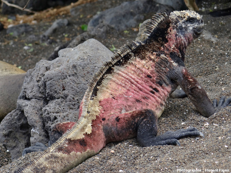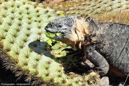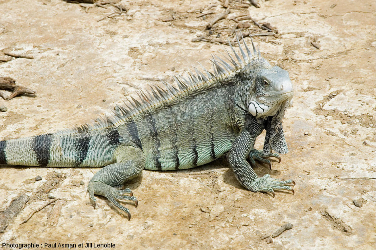 La différence de couleur de ce mâle par rapport à celui de la photo précédente est due à la saison de reproduction. Les iguanes mâles arborent alors une livrée jaune-rouge qui pourrait attirer les femelles.