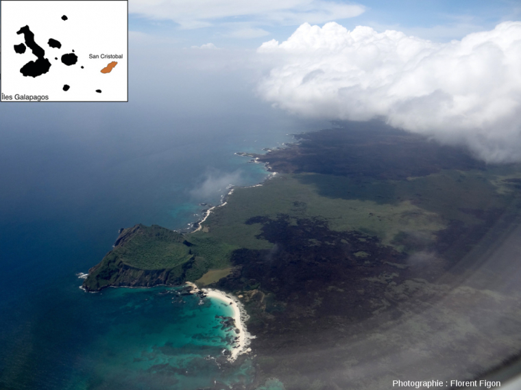 La vingtaine d’îles majeures des Galápagos est formée de plusieurs centaines de volcans, dont certains sont actifs aujourd’hui et entrent régulièrement en éruption. La topographie de chaque île nous renseigne sur son activité volcanique et donc, indirectement, sur son âge. Les îles Isabela et Fernandina, à l’Ouest, possèdent des reliefs qui culminent à 1707 et 1476 m respectivement, alors que San Cristobal, à l’Est, culmine à 730 m. Cette dernière île n’est plus active depuis plusieurs siècles (Geist et al., 1986 [6]). Les laves émises aux Galápagos et les roches correspondantes sont majoritairement basaltiques. Ces volcans majeurs sont de type volcan bouclier (cf. Exemples de volcans boucliers : Galápagos, La Réunion, Islande, Sicîle, Tahiti ).